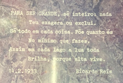 Para ser grande, se inteiro: nada Teu exagera ou exclui. Sê todo em cada coisa. Põe quanto és No mínimo que fazes. Assim em cada lago a lua toda Brilha, porque alta vive.