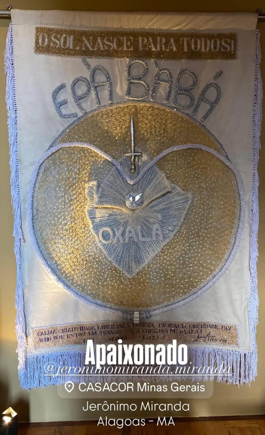 Pedro , imagine toda essa pedraria uma a uma passando por minhas mãos, ponto a ponto e repetidamente até três vezes por unidade. Cozer um estandarte,  tapetes, bandeira, de opiniões que divergem os expectadores da Arte ,  é algo extraordinário para mim , às vezes fico a imaginar que tantos fragmentos se formaram saindo de minhas mãos,  é poder comparar as grandes dunas que se formam com minúsculos  grãos de areia. O prazer, o extinto é tão intenso que posso constar uma força sobrenatural que povoa o meu ser! Ser uma artista que já nasceu artista, filho de uma artista, gerado no ventre de uma super mãe que alimentou através de um cordão umbilical carregado de símbolos que se diz Arte. A labuta é prazerosa mais cansativa, é forca mais também fracasso, cair e levantar e saber que a criação precisa ser feita,  insistir e concluir. Nem tudo sai do jeito que se projeta , o tecido parece mortal, mas tem vida, reage e precisa ser domado , quantas agulhas se romperam , novelos e novelos de linha se entrelaçam para contar uma história narrada mais vivida na espiritualidade do meu ser. O alicate é essencial para romper as fibras de dureza , é preciso perfurar para não rasgar, é preciso equilíbrio, paciência,  suportar, muitas vezes ser furado, como se algo tivesse a necessidade de um exame de DNA. Continuo a dizer é mais fácil fazer que explicar a construção. Meus estandartes são autorais, não faço por encomenda , dinheiro é necessário,  mas jamais dinheiro paga um filho que nasceu do amor, do prazer de ser artista, convicto de meus valores,  como sempre digo, o marketing faz o preço o valor somente quem faz pode viver tamanho prazer. Enfim é minha homenagem ao maior de todos os orixás,  Jesus é necessário para acalmar a humanidade. Epà bàbá! Sou mistura de raças, sou brasileiro, nordestino, alagoano.