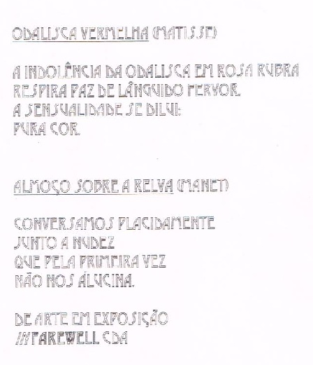 Carlos Drummond de Andrade (Itabira, Minas Gerais, 31 de outubro de 1902 — Rio de Janeiro, 17 de agosto de 1987). In “Farewell”, capítulo “De arte em exposição”