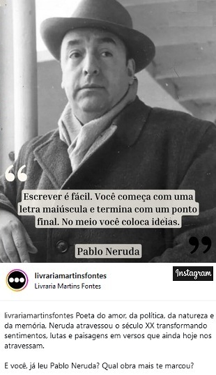 Pablo Neruda (Parral, Chile, 12 de julho de 1904 — Santiago, Chile, 23 de setembro de 1973). In “Canto geral”. Rio de Janeiro: Editora Bertrand Brasil, 2001, 11ª edição. Tradução de Paulo Mendes Campos